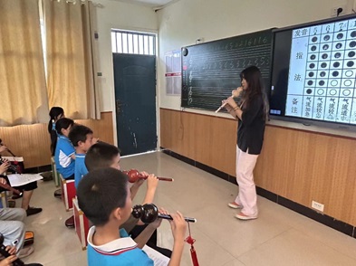 图中为志愿者们和孩子们一起上葫芦丝的小课堂,孩子们十分配合,志愿者们也在认真的教学。(廖垣樯 摄)