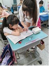 图为晚自习作业辅导时,志愿者在为小同学解疑答惑。(廉博雅 摄)