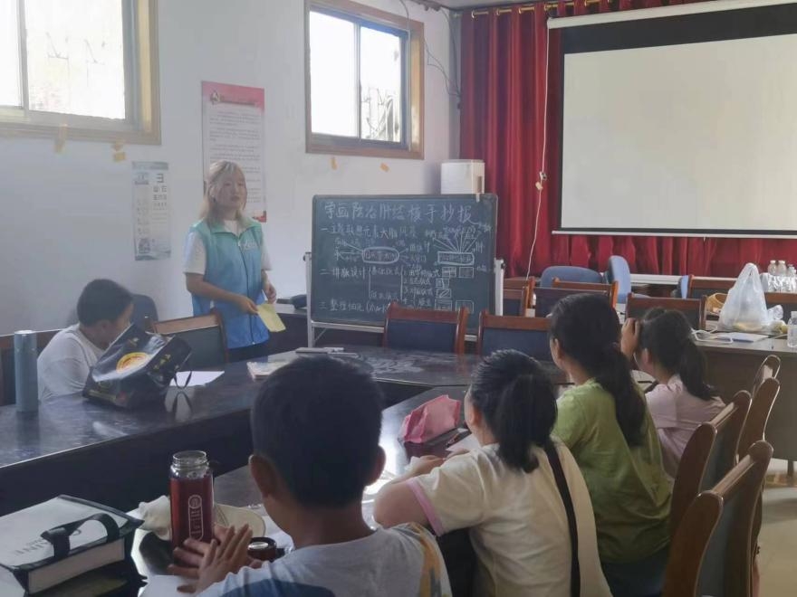 第三场,宣讲队另一组成员来到山东省青岛市黄岛区琅琊镇胡家山村,走进学校为孩子宣讲防治结核的知识。利用在黑板上写思维导图的方式,宣讲团直观地向学生们展示结核病的相关知识,积极地和孩子们互动,维持课堂的趣味性。利用短视频和演讲进一步强调肺结核防治的要点之后,宣讲团带领孩子们进行防治肺结核主题的手抄报绘画,并在教室里开设作品展览,鼓励孩子们为前来参观的家长讲解肺结核防治的重要内容,分享自己作品的设计思路。