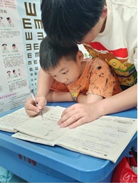 图为小朋友们主动向志愿者老师们求助数学题。(廖垣樯 摄)