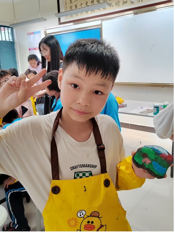 图为小朋友分享自己的石头画作品。通讯员 苏拉拉 摄