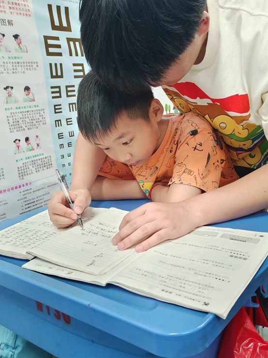 图为支教老师辅导小朋友写作业。通讯员 苏拉拉 摄