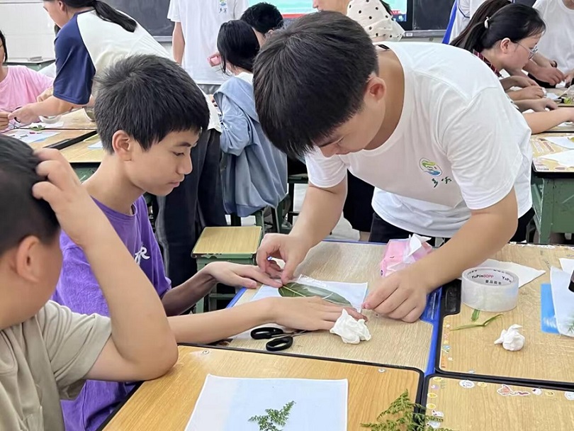 拓印在中国有着悠久的历史,以一种用纸、墨将文字拍印出来,以便保存和传播的工艺手法。团队成员以宣讲的方式让同学们领略拓印技术的基础知识以及基本操作,为使同学们能够趣味性的学习,团队采用就近原则分组带领同学们在校内收集植物,让他们亲身体验植物拓印从采集植物、用明矾水浸泡,到固定植物、反复捶打,再到获得最终成品的过程。由此,同学们在锻炼自身创造能力、感悟传统文化独特魅力的同时,与大自然亲密接触,领悟独属于大自然的风采。