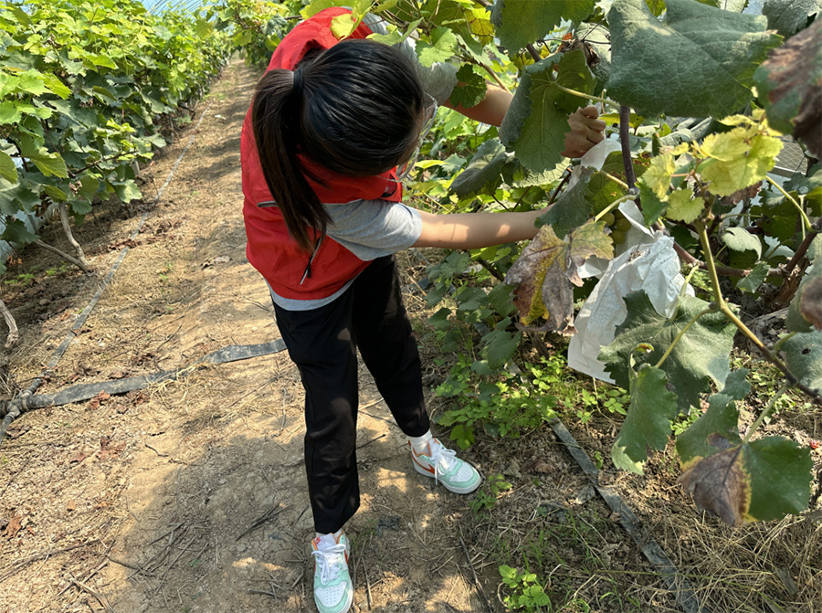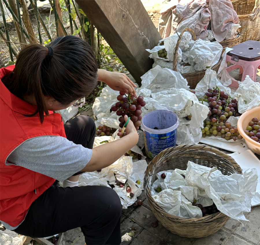 谯城区六集村正值葡萄成熟季节,果农们销售却成为了问题。为助力果农,南星南志愿服务队来到了巨峰葡萄采摘园。炎炎烈日下,在地里先采摘,接着一一修剪,除去坏果、品相差强人意的葡萄,最后卖力向过路车辆推销,队员们就葡萄品种、甜度、价格一一向买家介绍;同时为加大售卖量,王如梦同学积极联系六集村各大超市老板,沟通是否能以一个美丽的价格收购果农们的葡萄、以此扩大销售渠道、增加销售量。经过三天努力,成交金额达3420元,果农们喜笑颜开。