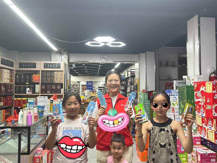 本次活动内容主要分为知识宣讲和物资捐赠以及绘画三个部分内容。首先和超市老板沟通,在超市入口设立保护口腔小立牌,对于进入超市的小朋友,王如梦同学会向他们普及基本口腔小知识,比如《蛀牙是怎么生长的》、《如何正确刷牙》,并向小朋友及家长演示正确的巴氏刷牙法。同时可小朋友们互动,宣传一些口腔小知识,孩子们积极回答问题。作为鼓励,送给孩子们小牙刷、牙膏、彩笔、卡通便利贴以及牙线等,希望能增强大家口腔健康意识,保持健康好牙,笑出美丽!
