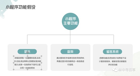 我们初步设想为显示各中草药的重要信息等并预想实现关联功能。并可通过查询名字或者功效来寻找药材来更深一步进行信息显示。以及我们还预想设计留言系统,希望用户可以做出留言评价等。