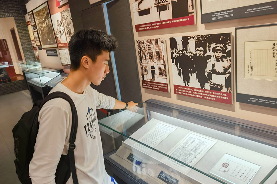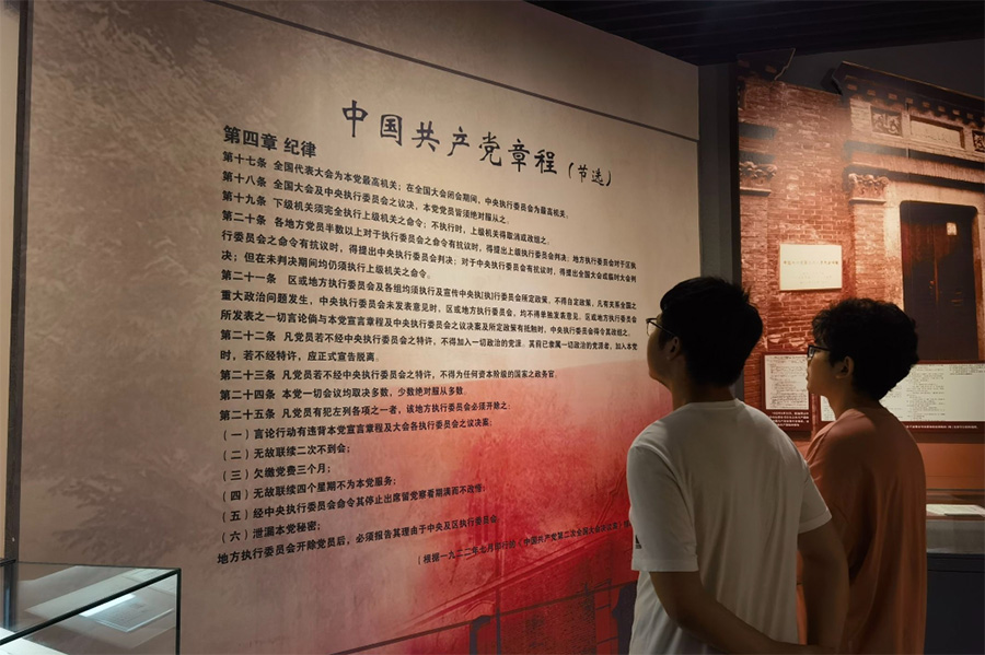 一进入陈列馆,他们就被迎面而来的一排巨大的烈士雕像吸引住了,旁边上镌刻着中共党章,眼前的陈列馆仿佛是一本沉甸甸的历史书。展览陈列着大量的文物、照片和文件,记录着中国共产党建立和发展的关键时刻中共产党人严守纪律的光辉事迹。他们紧紧注视着每个展品,试图从中洞悉共产主义信仰的力量和革命思想的不屈不挠。
