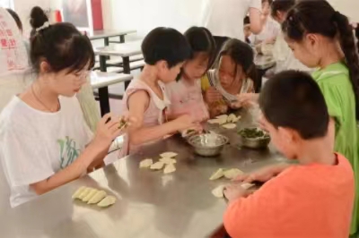在孩子们简单地清洗了手心手背之后,饺子皮已经忍不住“跳”到了手上。在一张张的面孔下,是肆意流淌的汗珠;在一幕幕的剪影下,是倏忽即逝的笑颜;在一双双的小手下,是形状各异的饺子。似月牙,其弧度与上扬的嘴角可比拟;似荷包,塞满了美味的肉馅;似客船,载满了孩子们的热情;似金钩,勾起了孩子们的食欲。孩子们各显神通,饺子的形状不再被定义。弹指之间,饺子已经铺满了饭桌,老师带着孩子们的目光徐徐而至,饺子们似乎已经迫不及待想跳水,孩子们为了夺得前排的机会,争先恐后地夸赞起老师来,好一番“百鸟争鸣”的景象!煮好的饺子简直馋涎欲滴,在一顿狼吞虎咽之后,飞禽走兽全在盘子上了。