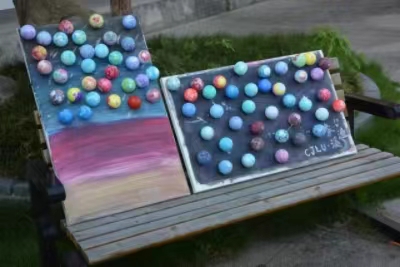 一颗颗小星球在阳光之下炫耀夺目,晾晒好之后,小朋友们亲手将自己的小星球插到绘制好的星空板上,创造出了一个属于孩子们的小小宇宙。