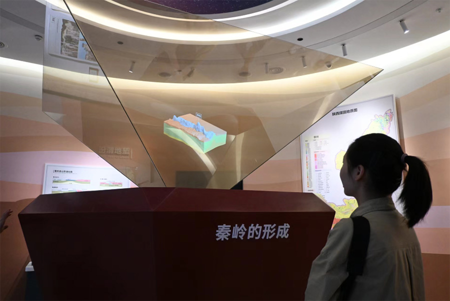 实践团首先参观的是自然展馆中的地质万象厅,在地质万象厅中实践团通过互动体验和线上讲解了解了秦岭的成因,秦岭的地貌以及秦岭的土质和气候条件等,同时了解到当地时常有暴雨和山洪发生,实践团也确定了气象防灾减灾宣传的主题。