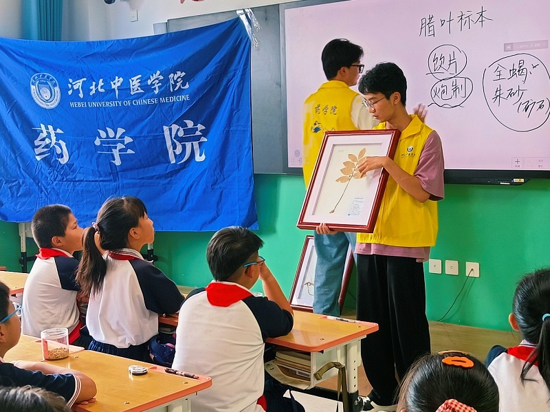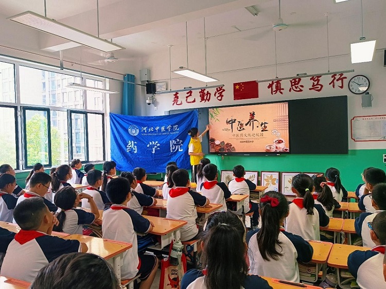 中医药文化是中华民族的瑰宝,是优秀传统文化的重要组成部分。为全面贯彻《“十四五”中医药文化弘扬工程实施方案》,继续推行《"健康中国2030"规划纲要》,着力弘扬和传承中医药文化,2023年9月7日,河北中医药大学药学院中医药文化科普团走进石家庄市鹿泉区第三实验小学开展本学期第一期中医药文化进校园活动,向小学生们展示中医药文化魅力。