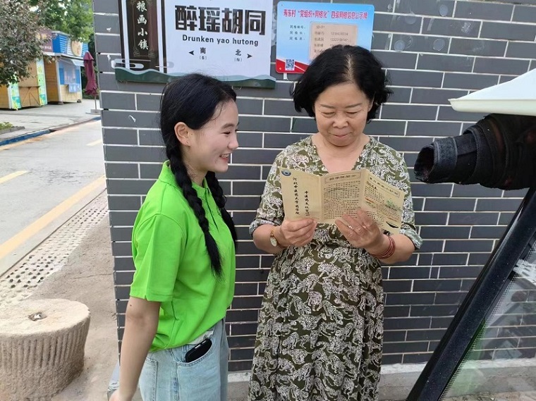 图为实践团成员为当地居民发放并讲解中医药文化宣传册