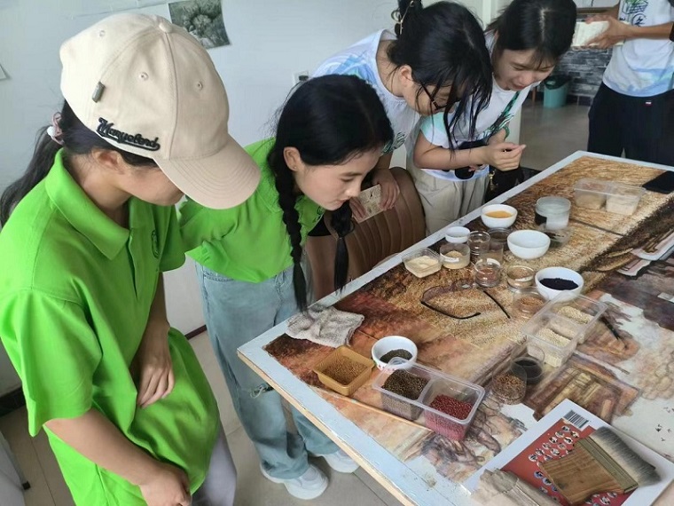李凤海先生向实践团介绍到,在他创作的粮画作品中,许多都运用了中草药的药粉本色。他们从宋代的粮画制作中得到启发,将中草药炮制技术与粮画创作相结合,通过使用中草药的色彩来展现画作的配色效果。这样的做法不仅使画作的颜色更加鲜艳,而且也进一步保留了中草药和五谷的传统气息,展示出小镇丰富的文化底蕴。