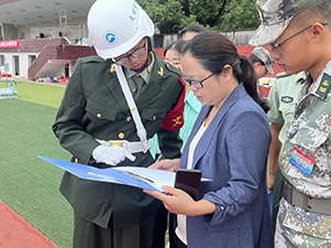 2023年9月21日,土木工程学院23级新生在第二田径场继续挥洒汗水,体验他们充实的军训生活。为了展现对军容风纪的重视,我院党委副书记陈笑、学工办主任周姣术和校督察队队员到达军训场地,与教官们一起对新生的军容风纪进行了全面的检查,确保新生们牢记纪律,保持良好的形象。
