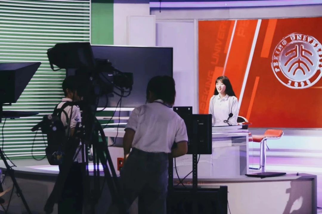 7月4日实践的第一天上午,伴随着蒙蒙细雨,实践队员来到了万千学子梦寐以求的高校——北京大学。在北京大学,同学们参观了位于新闻与传播学院的融媒体中心,亲身体验了北大融媒体中心的演播室。一进门便是展示有“北京大学”字样与学校校徽的巨大背景墙,前方是一个专业的主播台。播出间中不仅有完整的录播屏幕、专业灯光以及摄影器材,还专门设置了供学生录制节目的房间。融媒体中心的老师还特别介绍道,在这个演播室中,北大学生会进行校园访谈等日常的录制与直播。
