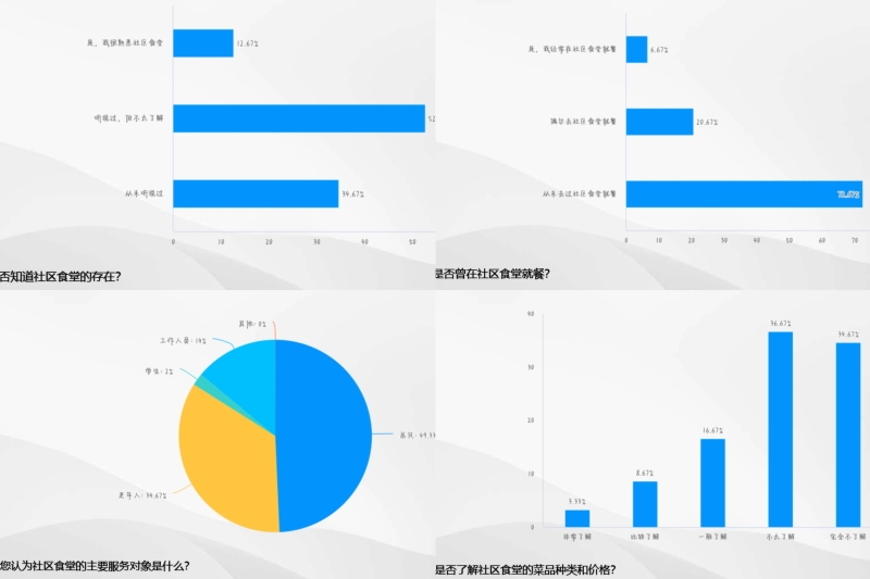 通过发布问卷,我们调查得出目前居民对于社区食堂的了解情况及其就餐意愿。根据得到的有效数据统计,约有13%的人知道并且熟悉社区食堂,52%的人表示听过但并不了解社区食堂,35%的人则完全不了解社区食堂。未曾去过社区食堂就餐的人数占比更是高达72%。由此可见社区食堂的宣传工作还有待进一步提升。这样才能让更多的人了解到社区食堂并让社区食堂发挥其自身作用。