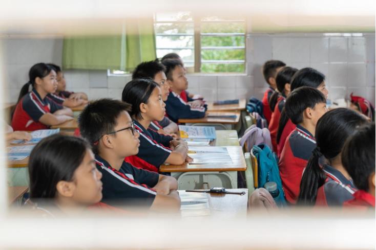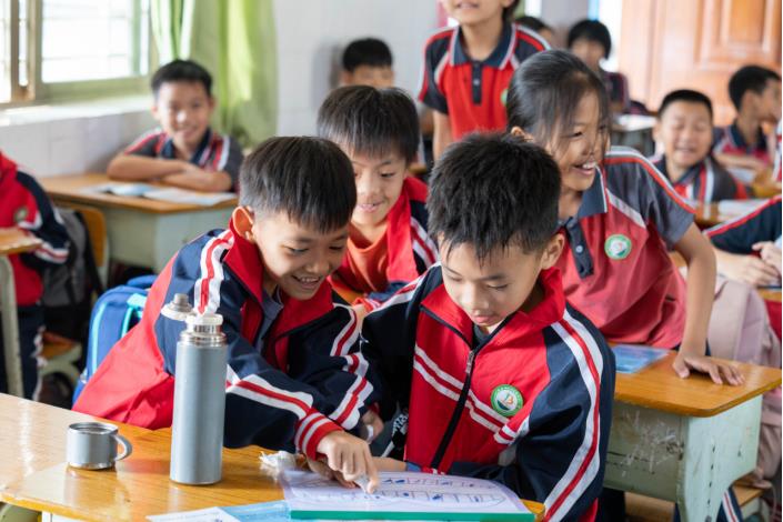 图为“绿创使者”社会实践队成员授课时孩子们认真听讲的场景