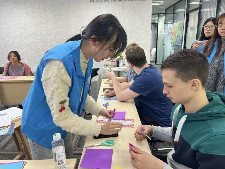 图为实践队队员为外国学生进行折纸指导 通讯员 王书阳 供图