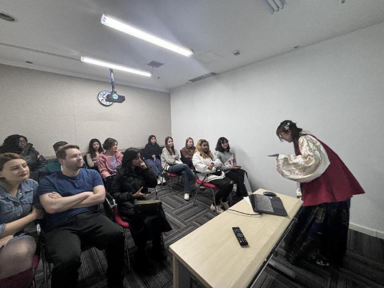 为了增强外国学生的参与感,除了汉服讲解,我们的公益课堂还安排了汉服折纸环节。这个环节主要是我和另一个队员一起负责,由我们来做折纸教学的指导老师。但他们并非都是英语母语者,汉语也基本是初学者水平,所以这让我们之间的沟通变得困难了许多,在讲解折纸步骤的时候我们尽可能的用简单的英语和汉语与他们进行交流,面对难以解释的话语时,我们便会用手势来沟通交流,沟通的困难并没有使得现场的氛围尴尬,反而变得更加其乐融融。大家在欢声笑语中体验汉服之美,感受华夏风尚。