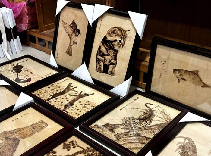 活动伊始,非遗烙画传承人顾春刚先生带领团队成员来到他的工作室,其中陈列着许多由他亲手制作的精美烙画作品,他为成员们一一介绍。无论是动物还是山川美景都具有丰富层次感。欣赏完作品后,顾先生向实践团介绍了烙画的起源和发展,使成员们进一步增强对烙画的认知和了解。接着,成员们观摩了顾先生烙画的完整过程,他通过烙铁笔在木板上烫出深浅不一的痕迹绘制了一幅栩栩如生的虾图。顾春刚先生还专门为实践团成员准备了木块材料和烙铁笔,以便亲身体验烙画过程。他说:“温度过高或过低,手法过重或过轻,都会影响整体的烙画图案,因此一定要进行适当的调控,才能绘制出一幅精彩的烙画作品。”在烙画时,成员们也意识到整个烙画的过程需要耐心和技巧,只有不断实践才能有所进步,非一朝一夕可成。