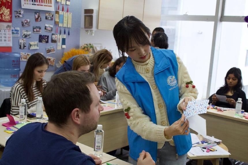 图为实践队员正在向新环球汉语学员演示汉服折纸步骤。中国青年网通讯员 王书阳 供图