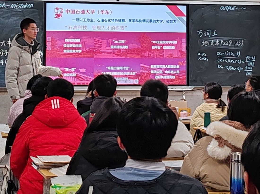 活动开始,宣讲队成员在学校公示栏处粘贴学校招生海报。在23日晚于班级中从多个方面介绍石大的特色与优势,包括学校悠久历史,卓越功勋,雄厚师资,良好学习环境等,同时还给同学们提出了几点备战高考的建议并播放了宣传片,发放宣传手册,并于24号早进行了个性化拓展宣讲,为同学们分享了丰富多彩的大学生活,两次宣讲过程交流氛围融洽,效果良好。