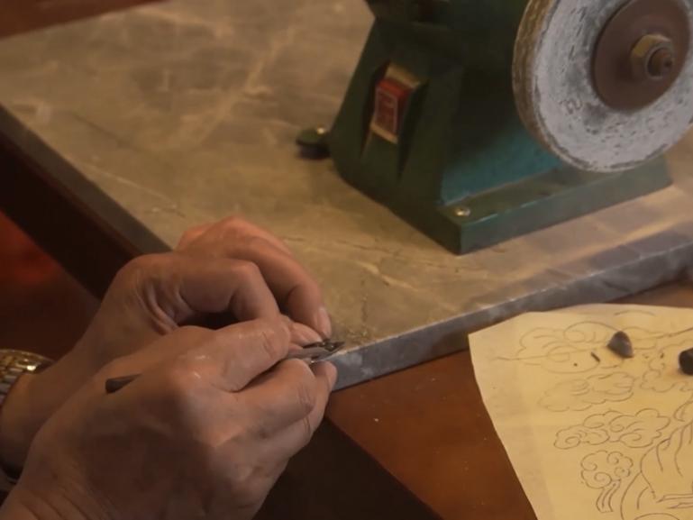 在与王师傅的交谈中,我了解到贝雕作品一共分为四大类型:平贴、浮雕、半浮雕和立体件,不同的类型有不同的制作方法,但贝雕的制作还是有一个固定工序的。但归根到底,有好的原材料才可以雕的出来好的贝雕,所以原材料的选取是尤为重要的,王师傅告诉我贝雕所用到的贝壳来自江河湖海,要根据稿件的需要从大小、纹理、颜色等方面来选择贝壳是极其精细的一个步骤。选定好贝壳后就到了制作的部分,首先是绘图,对设计稿件进行分解处理,将其变成一部分一部分的小图纸,之后便是后面的精雕细磨。其次是车磨,也叫切形,就是把贝壳变成图纸上的大概形状,然后再进行雕琢,用多种工具来细致的刻画出纹路等小细节。最后是粘贴,这一步极为重要,必须根据稿件需求和贝壳真实情况来选择合适的位置进行粘贴,要注意每个部分的摆放和整体的立体度,倘若能把这步做好了,那做出来的贝雕也会富有生气,不死板。有需要的时候还会给作品涂上明油,增强作品的艺术美感。