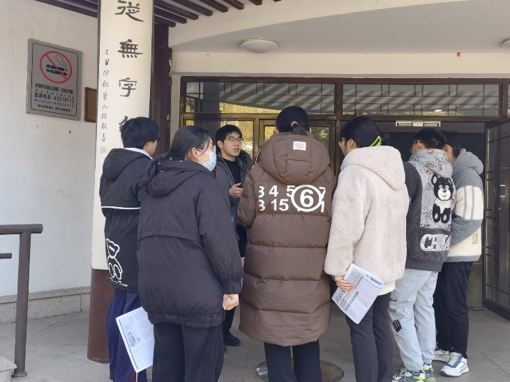 在结束了宣传点的宣传之后,团队成员穿过教室走廊,为聚集活动的同学们分发宣传资料,介绍河海大学概况。针对他们普遍存在的疑惑,三位团队成员一同为他们解答。在较为短暂的时间中,团队成员重点宣传了一些新设置、更为前沿的新兴、热门专业。