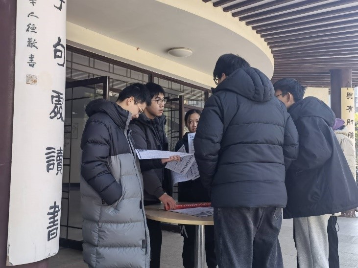在2024年1月26日,河海大学商学院“传河海之声,承一中之情”返校宣讲实践团来到江苏省苏州第一中学校。三位团队成员刘翔宇、兰双涛、范耕榷,提前在广场设置了宣传点,分发并为大家介绍刊印的资料。