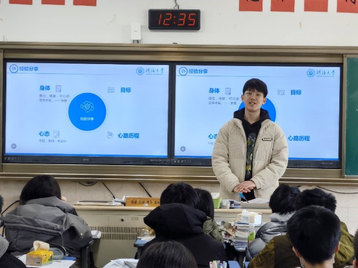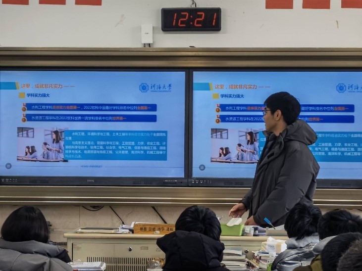 宣讲共分为两部分,第一部分为学校介绍;第二部分为心得分享。刘翔宇先为同学们播放了23年河海大学招生宣传片《润泽》,以宣传片结尾一句“成为纳百川之人”开启正式讲解,表达了“欢迎有志青年报考我校”的愿望。