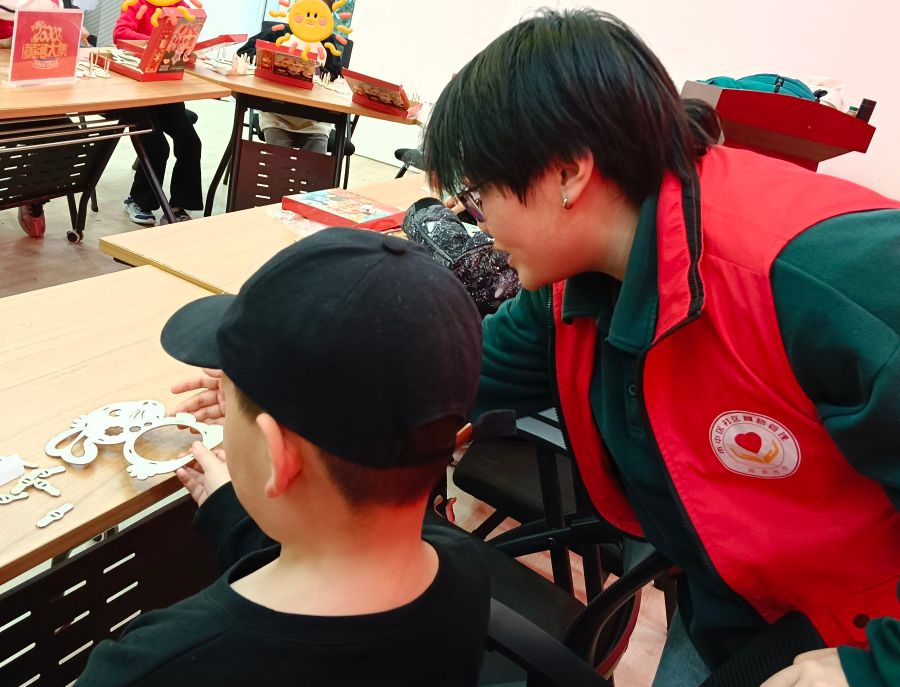 今天是乔晓涵同学和张月蓉同学来到市中区开展希望小屋社会实践的第二天。和第一天一样,小朋友们陆陆续续地来到了教室,在签到完成之后就坐到自己的座位上开始上午的自习时间。几位小朋友在作业完成后请张月蓉同学帮助他们检查,并辅导不懂的地方。下午是兴趣教学——木雕手工课程时间。小朋友们领取完材料后纷纷坐到自己的座位上全神贯注地拼插木雕,大家互帮互助,其乐融融。乔晓涵同学负责的两个小男孩被安排一起拼接同一个木雕,在最开始,两个小男孩跃跃欲试,都想自己完成全部的拼接过程,但在其他老师和乔晓涵同学的引导下,他们最终一起完成了整个木雕的拼接,在体验手工乐趣的同时也明白了合作的意义。课程的最后,孩子们高高举起手中自己制作的花灯,脸上洋溢着大大的笑容。乔晓涵同学表示这或许就是作为志愿者的重要意义。