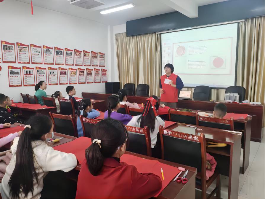 一是向小朋友们讲述剪纸这一中华传统文化的基础知识:“以剪为笔,纸上生花;剪纸顾名思义就是中国剪纸是一种用剪刀或刻刀在纸上剪刻花纹,用于装点生活或配合其他民俗活动的民间艺术。在中国,剪纸具有广泛的群众基础,交融于各族人民的社会生活,是各种民俗活动的重要组成部分。”然后以剪纸工艺这一世界级非物质文化遗产的历史和内涵为例,去向小朋友们讲述为什么要传承中华优秀传统文化,小老师讲到:“学习和深刻贯彻党的二十大思想,习近平主席在会上强调:‘我们绝不能抛弃中华优秀传统文化这个根脉。’对于我们青少年和青年来说,中华优秀传统文化里蕴含着中华上下五千年的历史——剪纸的红色底色;剪纸的用途等等都埋藏着中华历史的宝藏。我们要弘扬和传承中华优秀传统文化,不让历史虚无主义者盗窃,诋毁优秀文化。”
