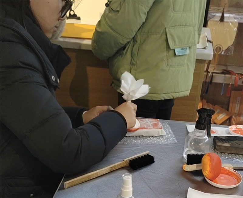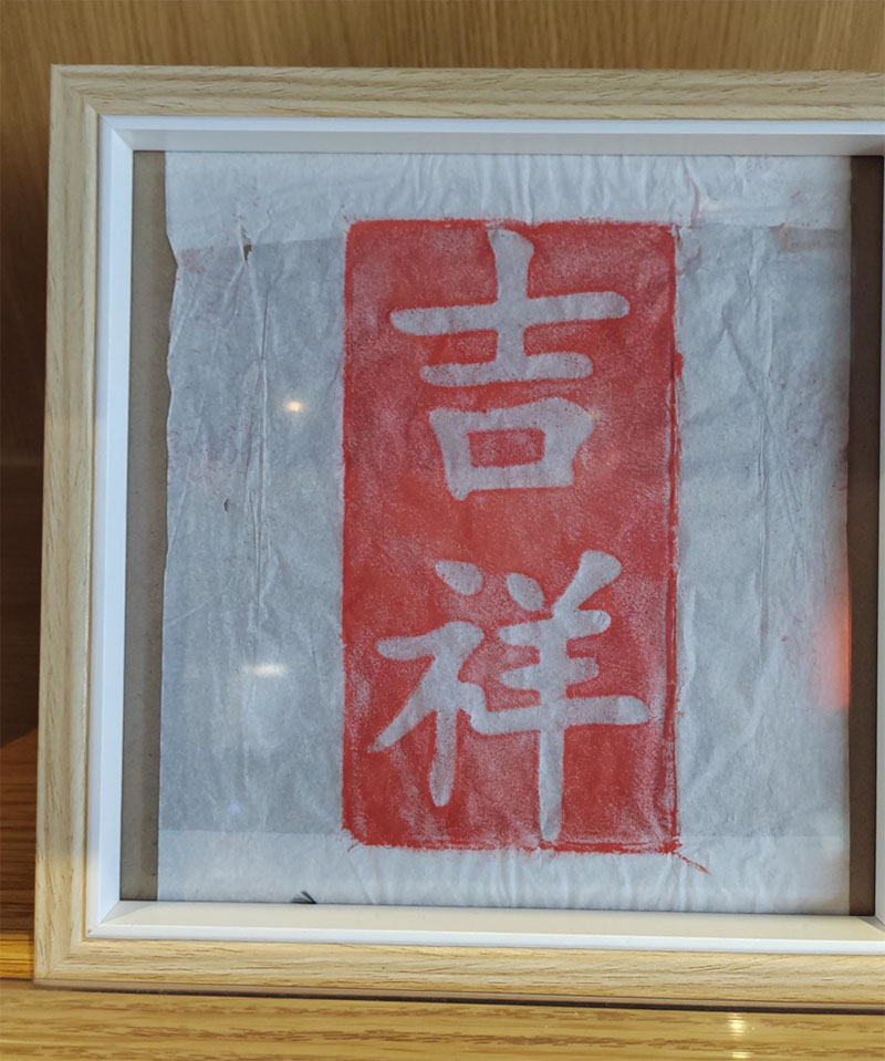 拓印是我国一项古老的传统技艺,距今已有千年以上的历史,其也称“传拓”、“捶拓”,现已列入国家级“非物质文化遗产”名录。在非遗体验馆内,在老师的帮助下,实践组成员亲自体验了拓印的过程。看似简简单单的一张纸,却是要经历选模、润纸、拓印、上墨等步骤。拓印分为“捶拓法”和“擦拓法”,此次采用的是捶拓法。拓印是一项极需要耐心的事,如果不能坚持下来拓片就会上色不均。