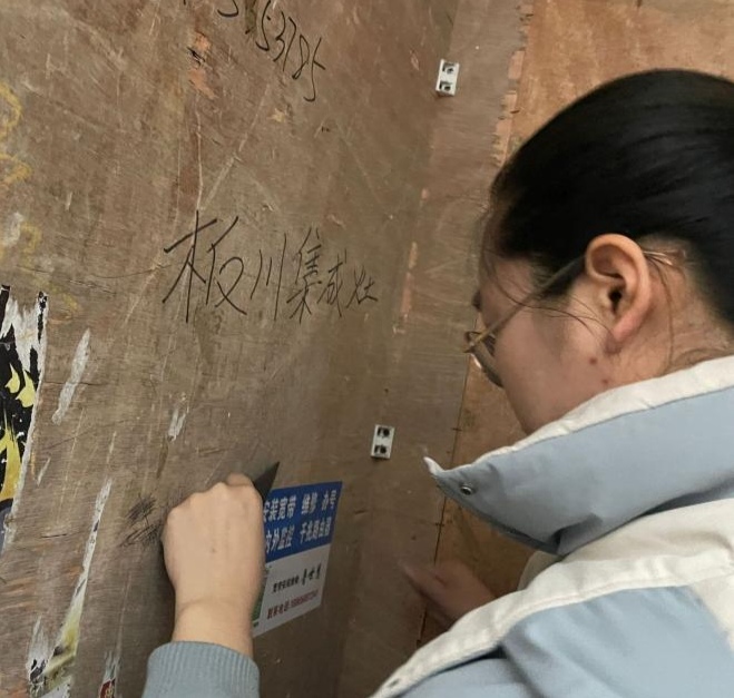 图为实践队员正在努力清楚社区墙上胡乱张贴的小广告。中国青年网通讯员 潘宇琪 摄
