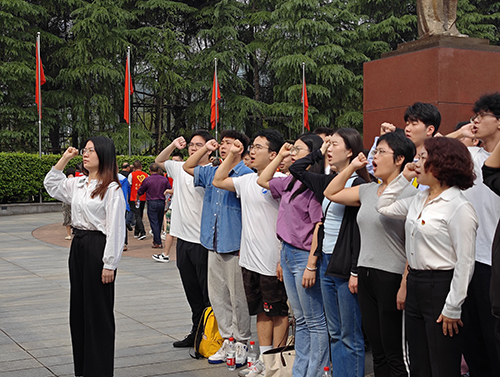 在毛泽东广场,党员们肃立在毛泽东铜像前,面对鲜红的党旗,坚定地举起右手,重温入党誓词,庄重宣誓。铮铮的誓言回荡在广场上空,凝聚着党员们弘扬革命传统,担当新使命的初心。