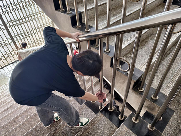 图为志愿者打扫土木楼卫生,清洁楼梯扶手。