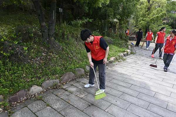 图为志愿者清扫月湖边的纸屑,确保月湖清澈美丽。