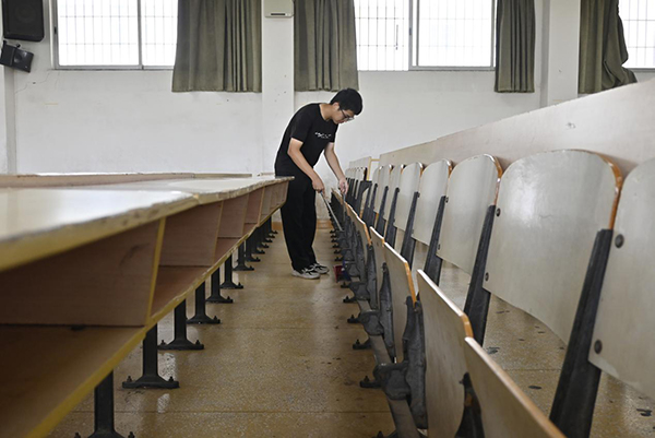 图为志愿者打扫第五教学楼教室卫生,确保教室整洁的环境。