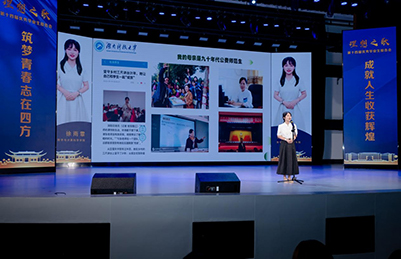 “保持热爱,奔赴山海。”信息与电气工程学院皮红伟是竞赛大神,从失败到四赛佳绩,热爱坚持铸就青春。他一年内完成多项国家级、校级项目,获国家级奖5项、省市级奖40余项,获湖南省创新创业优秀毕业生等荣誉,并保研至中南大学。他激动地说:“我感谢用汗水浇灌的青春,感谢四年的大学生活,感谢身边的老师同学,感谢一路有挑战同行。”