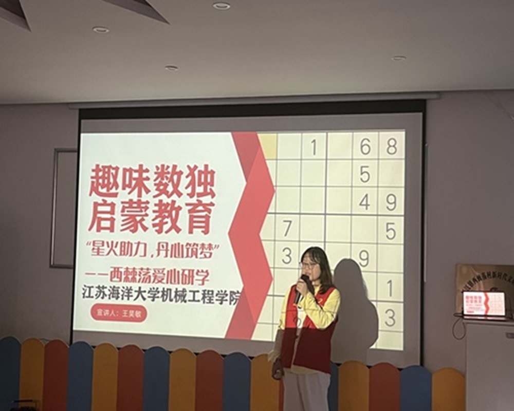 7月4日,江苏海洋大学机械工程学院“星火助力,丹心筑梦”——西棘荡爱心研学暑期社会实践团队在西棘荡村开展趣味数独启蒙教育课程。此次课程由教学组组长王昊敏进行宣讲。