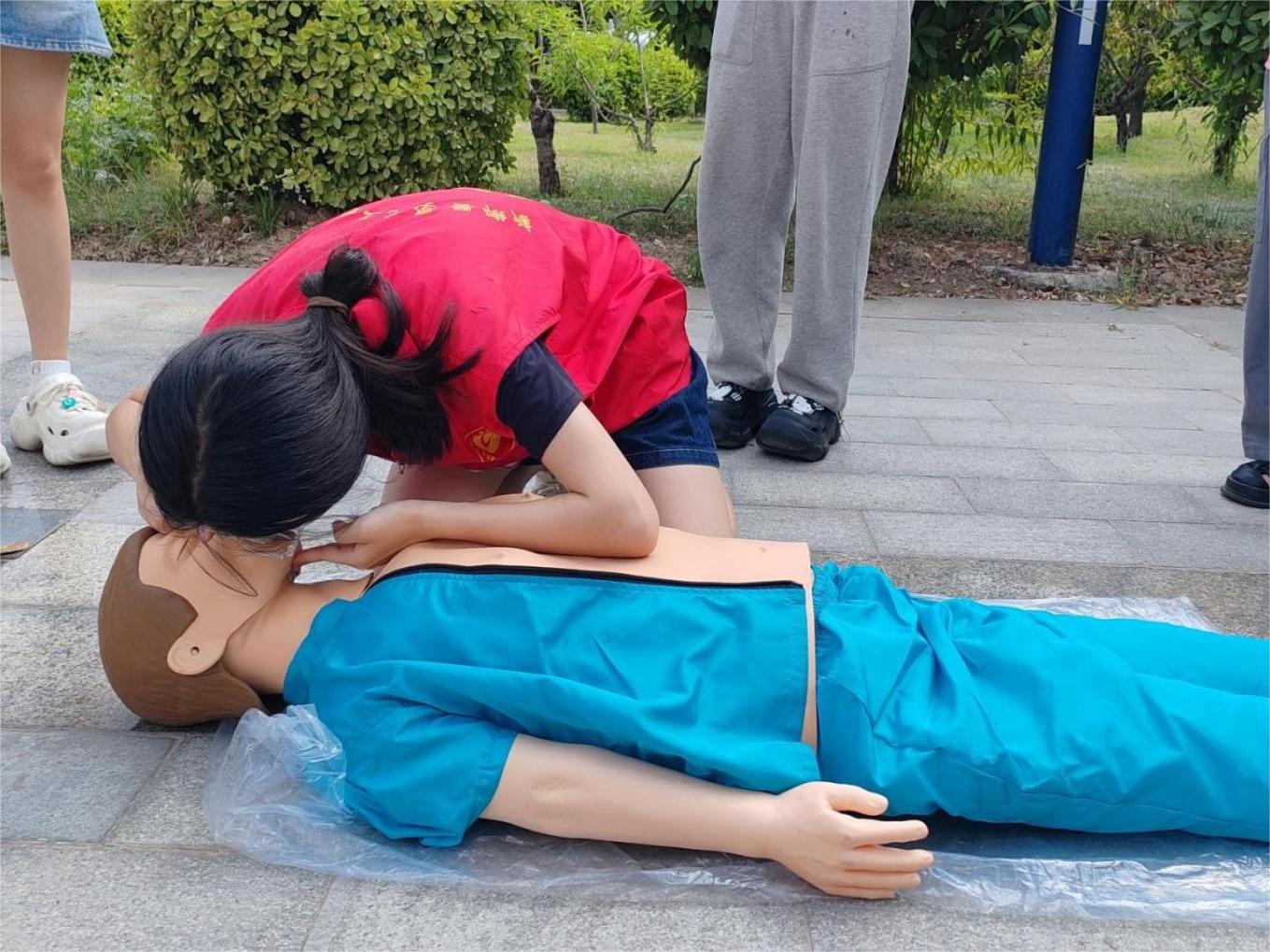 接着,在急救宣传区,掌握急救知识的冯若晴、杜冰燕、员艳同学为居民们讲解了心肺复苏、人工呼吸、海姆立克急救法等急救技能,并通过模拟演练让居民们亲身体验了急救过程。