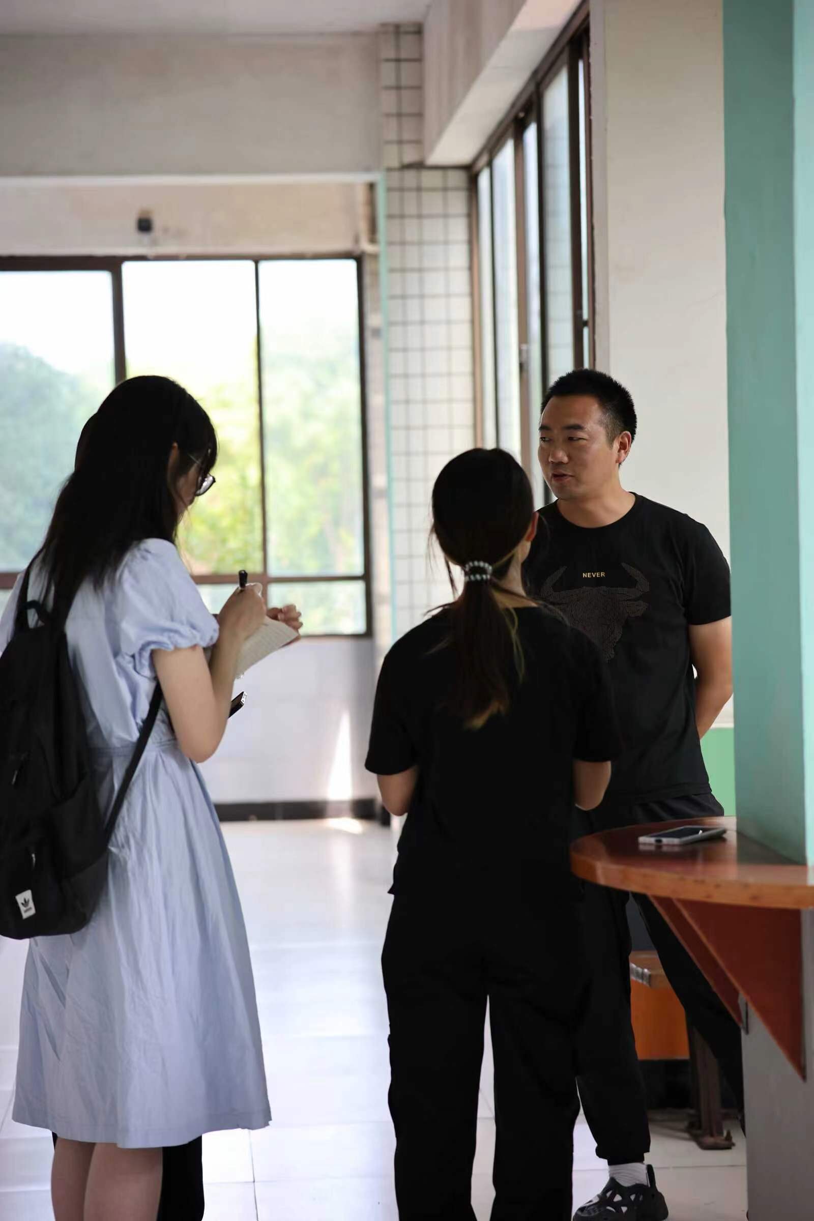 杨老师带领队员们进行了详细的参观和讲解。学校分别有一座主教学楼、一栋宿舍楼,规模较大。教学楼一楼是普通教室区,包括语文、数学、英语等的盲文课本教学,门口贴有课程表,下方配有盲文供学生认知。另外,二楼设有心理咨询室和发泄室,室内光照充足,遵循暖色调布置,为学生的负面情绪提供发泄的场所。学校老师们也会定期留意学生的心理状况,为其提供及时的陪伴和帮助。由于视力缺陷,杨老师提到,学生们的听力尤为敏感,记忆力较于常人也更强,所以在二楼专门开设了乐器教室供学生学习。在现场,团队成员也看到和听到了两位同学在讨论和哼唱乐曲,非常专注。同时,值得注意的是,学校另开设了计算机课程、中医理论课程、推拿实践课程,并配有医疗按摩实训基地会模拟接待客人,提前为学生们将来就业奠定下基础。