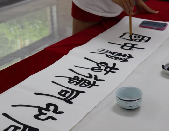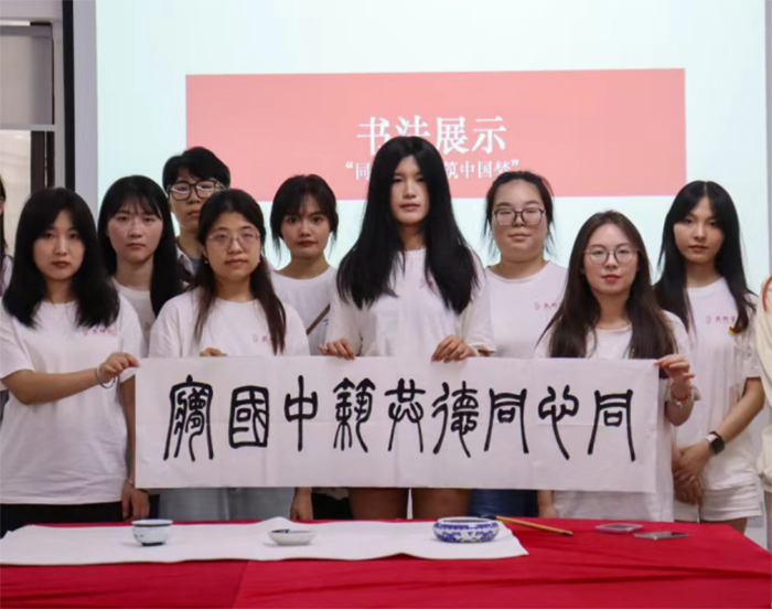 在书法展示环节,书法专业的同学挥毫泼墨,以“同心同德共筑中国梦”这一力透纸背的佳作,完美融合了对社会实践活动的深刻感悟。这不仅是美院学子艺术造诣的一次展现,更是一次心灵的共鸣,是对未来发展的美好期许,展现了美院学子对中国特色社会主义政治制度的坚定信仰与对未来共筑中国梦的无限憧憬。