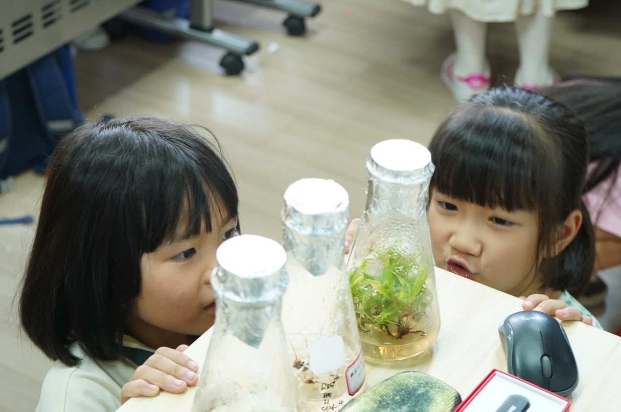 除了生长在培养瓶中的转基因马来甜龙竹的组培苗,实践团成员还以图片的形式向同学们展示了转基因马来甜龙竹组培苗制作的景观瓶以及已成功驯化栽种在花盆中的转基因马来甜龙竹,向同学们展示了一个想法,变成实验室中成功的紫色转基因再生苗,再变成生活中的盆栽、景观瓶的过程,诠释了一个从不普通到普通的转变,以此来告诉同学们科技能走进生活,也将走进生活。