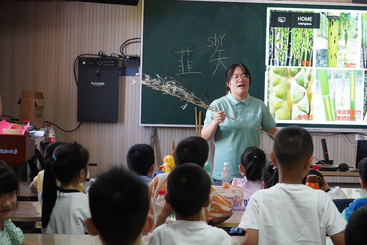 竹科普课上,实践团成员还向孩子们展示了浙农林大竹研院林新春教授团队成员创制的转