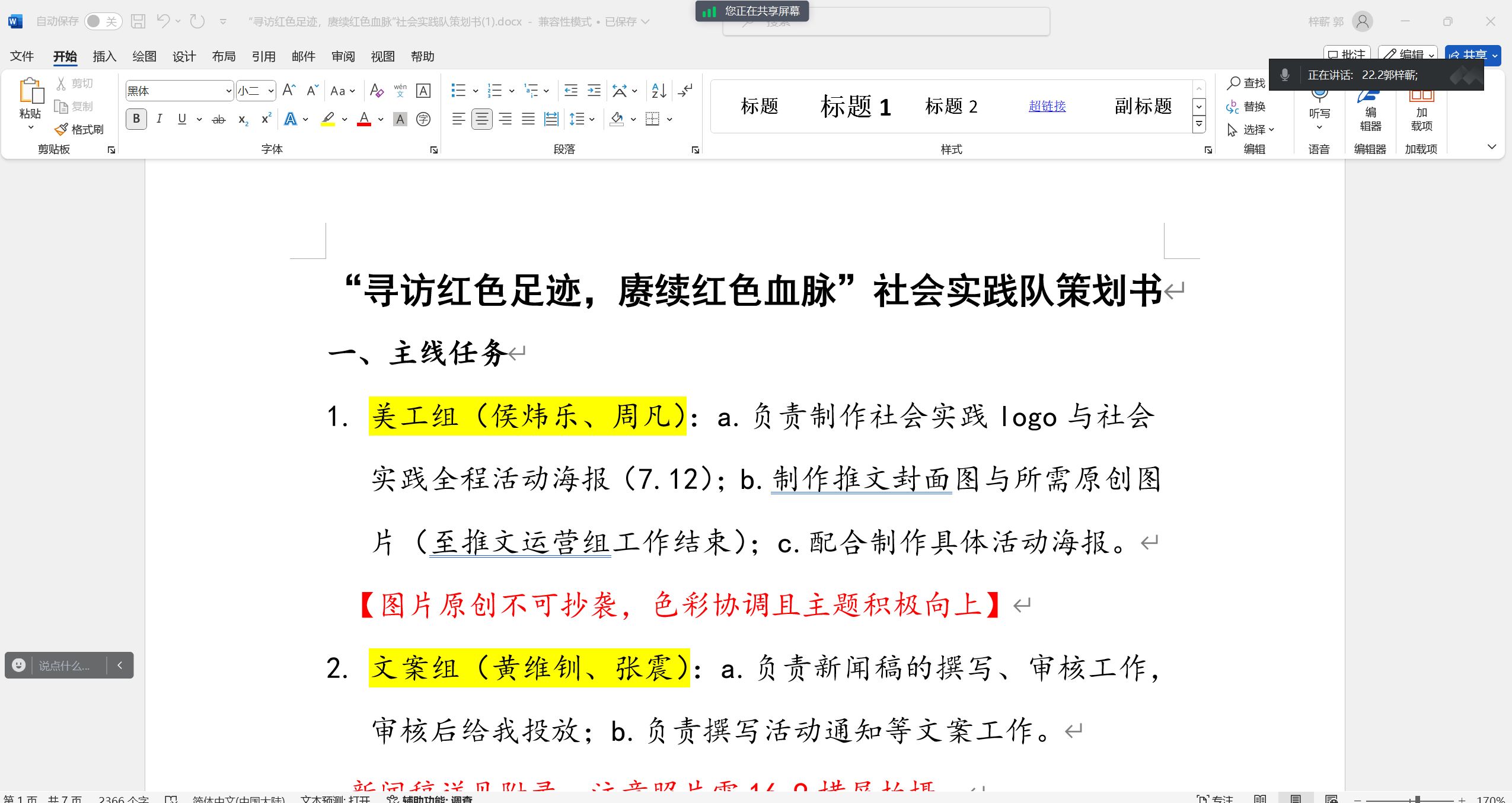 紧接着,郭梓蕲向各位成员讲解了本次社会实践的时间与流程。本次社会实践将于7月15日至8月15日以线上线下相结合的方式开展。团队将采取社区宣讲、红色遗址走访调查、电台录制等多种形式宣传红色精神,传播革命文化,了解社会实践背景与现状,并希望能引起社会各界广泛关注。同时,郭梓蕲强调了社会实践宣传的重要性,指出社会实践不仅需要做出来,还需要让大家看得到。为此团队采取了推文、新闻稿、媒体平台等形式进行宣传,积极探索宣传社会实践的渠道。