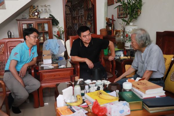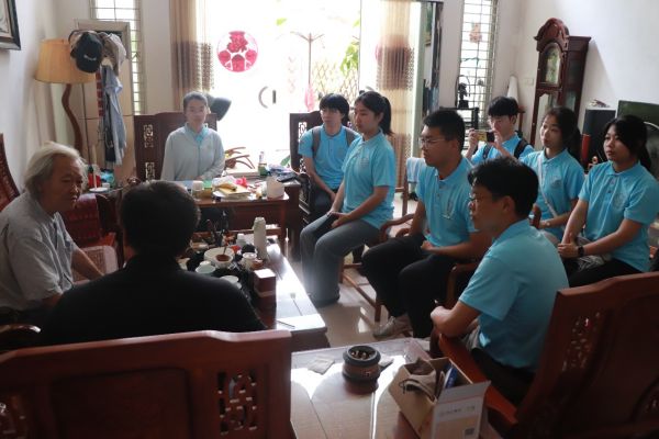 实践队一行首先来到福建省东山县博物馆原馆长、研究馆员陈立群家中,陈先生是研究南岛语族和“东山陆桥”的先驱,他为队员们讲述东门屿岩画群和大帽山贝丘遗址与南岛语族的渊源,与带队老师们深入交流“东山陆桥”以及闽台史前文化关系。陈先生的介绍,深化了实践队师生对南岛语族迁徙活动与其两岸史前文化交流的认知与感悟。交流过程中,陈立群先生向实践队赠送他于2012年编著的《海峡陆桥》著作。