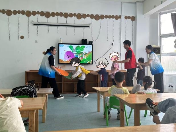 6月24日,团队成员分成 3 组开展活动。在大班,团队成员以生动的形式向小朋友们介绍海洋动物,科普保护海洋环境知识,并讲解五官知识及自我保护要点;在中班,协助老师组织“拔萝卜”游戏,锻炼孩子们的身体协调和团队协作能力,并指导写字画画以激发创造力;在小班,协助老师耐心传授孩子们叠被子、正确吃饭等日常技能。下午,全体师生在操场开展集体活动,共同放飞身心。