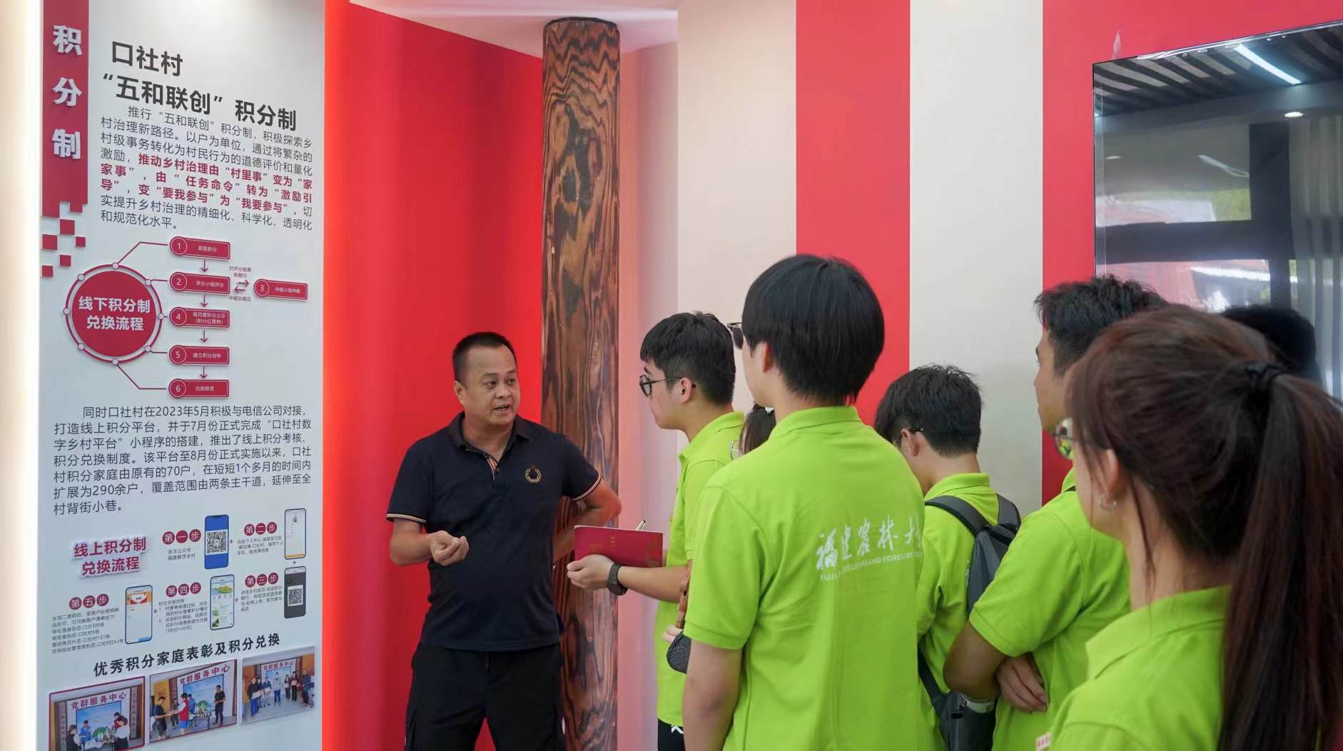 其中,作为示范村之一的口社村推行了“五和联创”积分制,将繁杂的村级事务转化为村民行为的道德评价和量化激励,村民们可以用积分兑换生活用品,同时优秀积分家庭还会受到表彰。这一制度也广受村民们的欢迎,在探访口社村的过程中,实践队员们发现几乎每家每户都挂上了积分家庭的门牌。