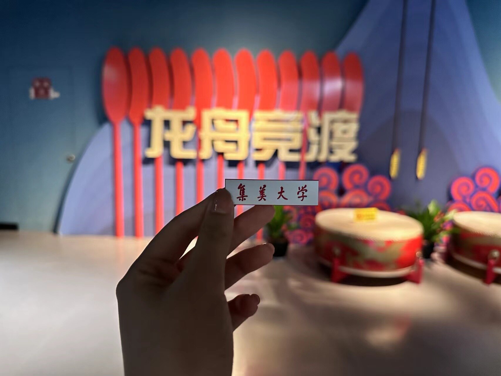 图为集美大学校牌与“龙舟竞渡厅”合照 施昕怡摄